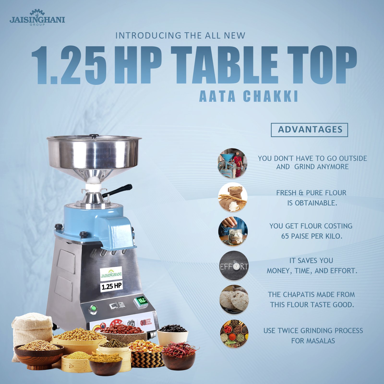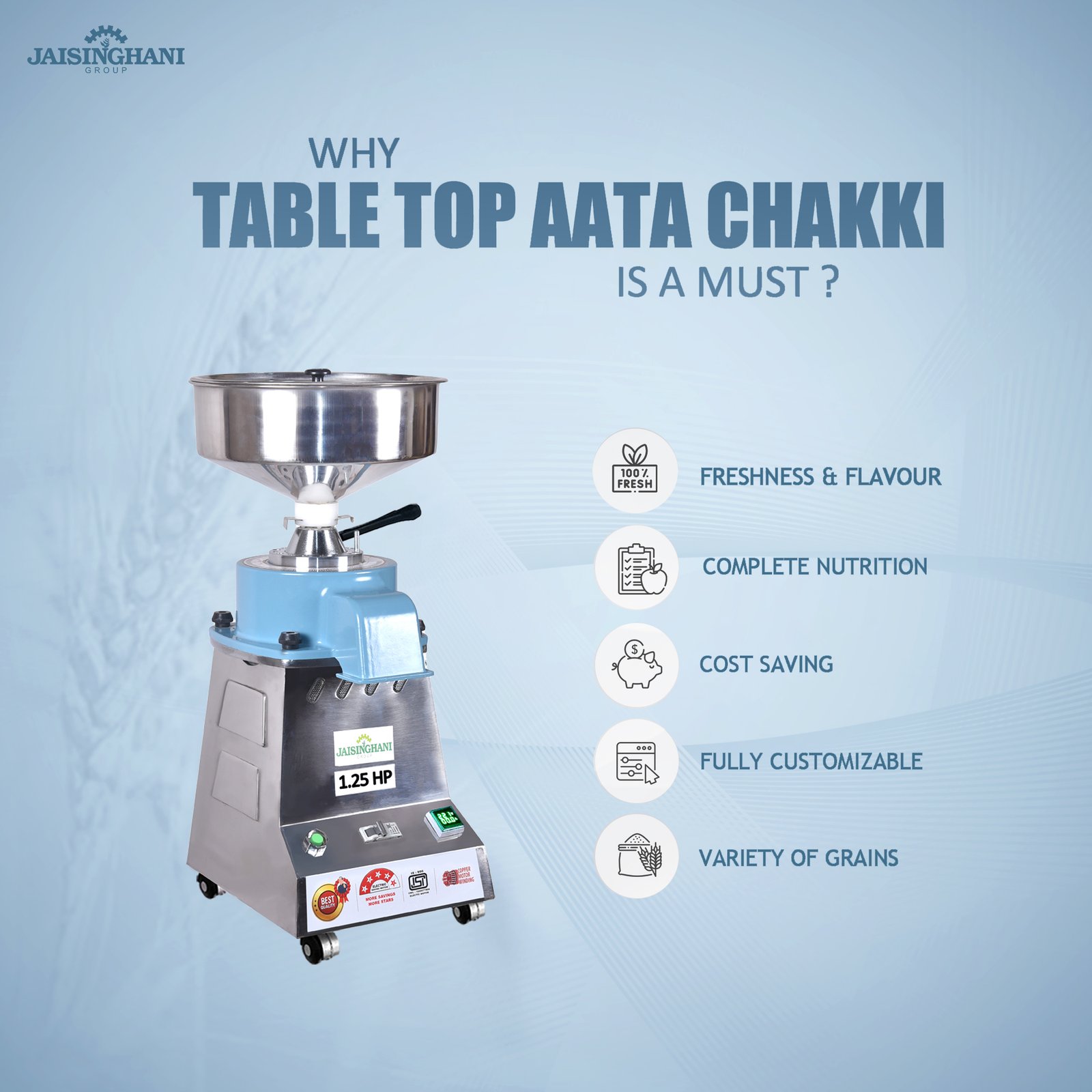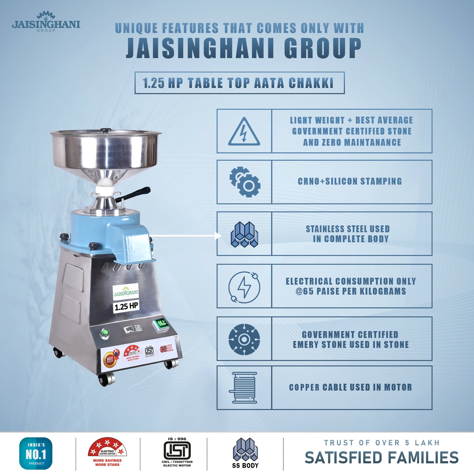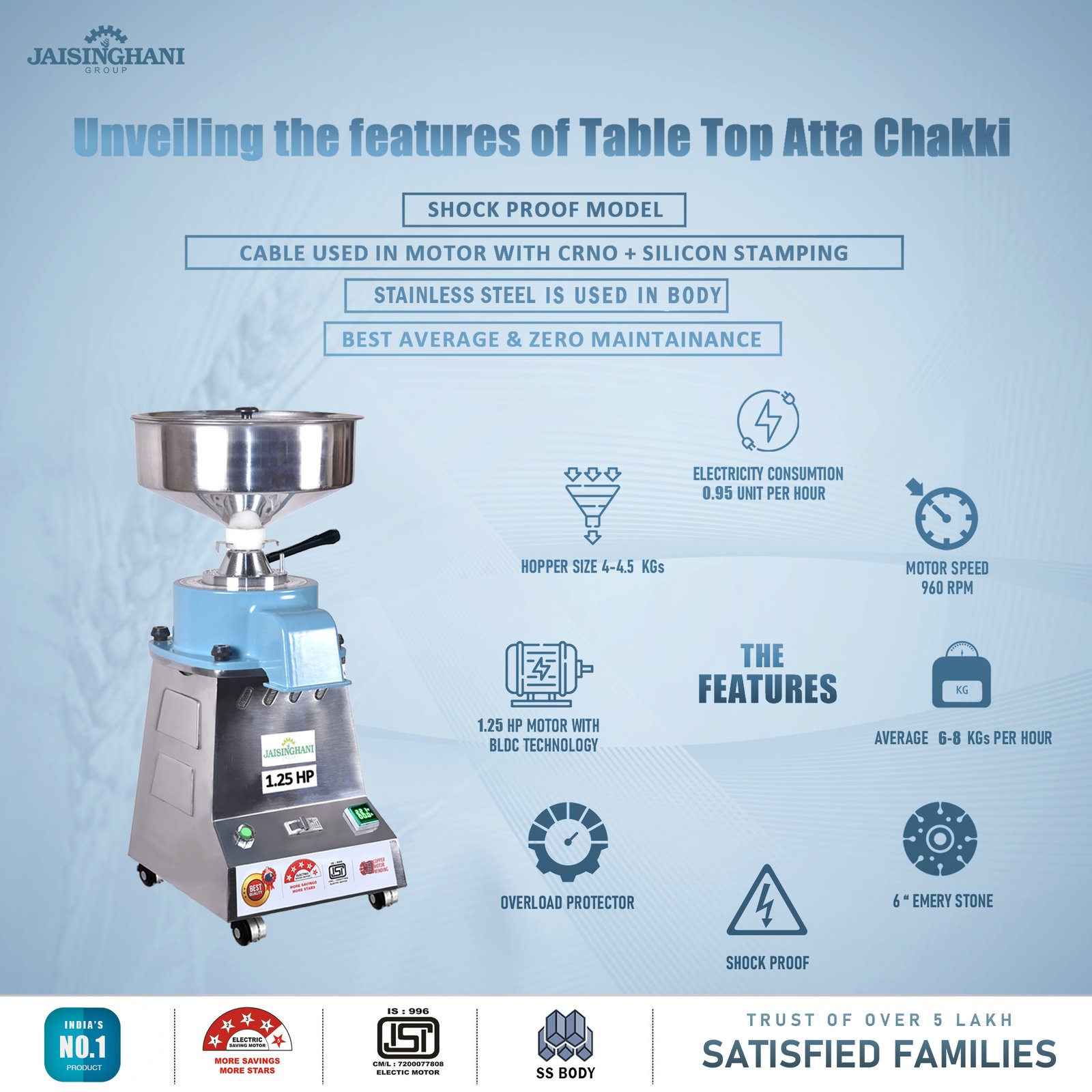 Jaisinghani Group 1.25 HP Stainless Steel Stone Atta Chakki | 6 - 8 Kg/Hour Grinding Capacity | Next-Gen Commercial Stone Flour Mill | Fresh Flour Atta Chakki Machine | Energy Saving