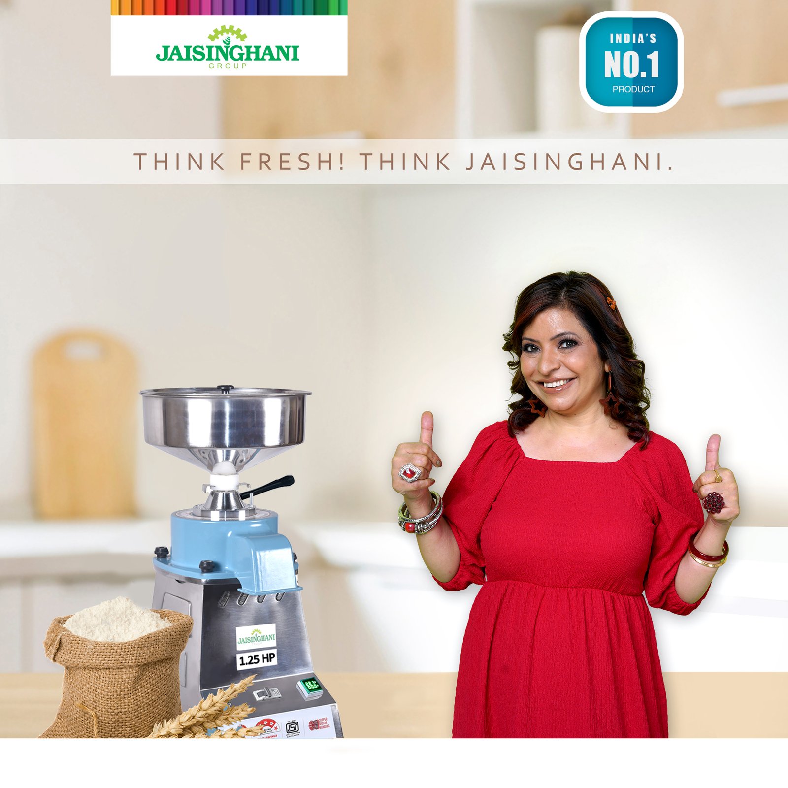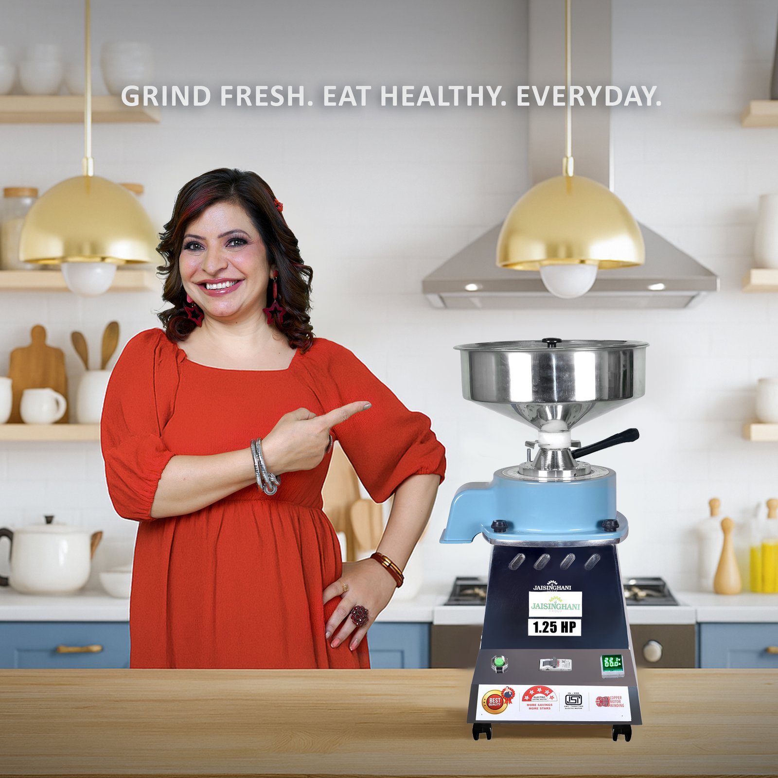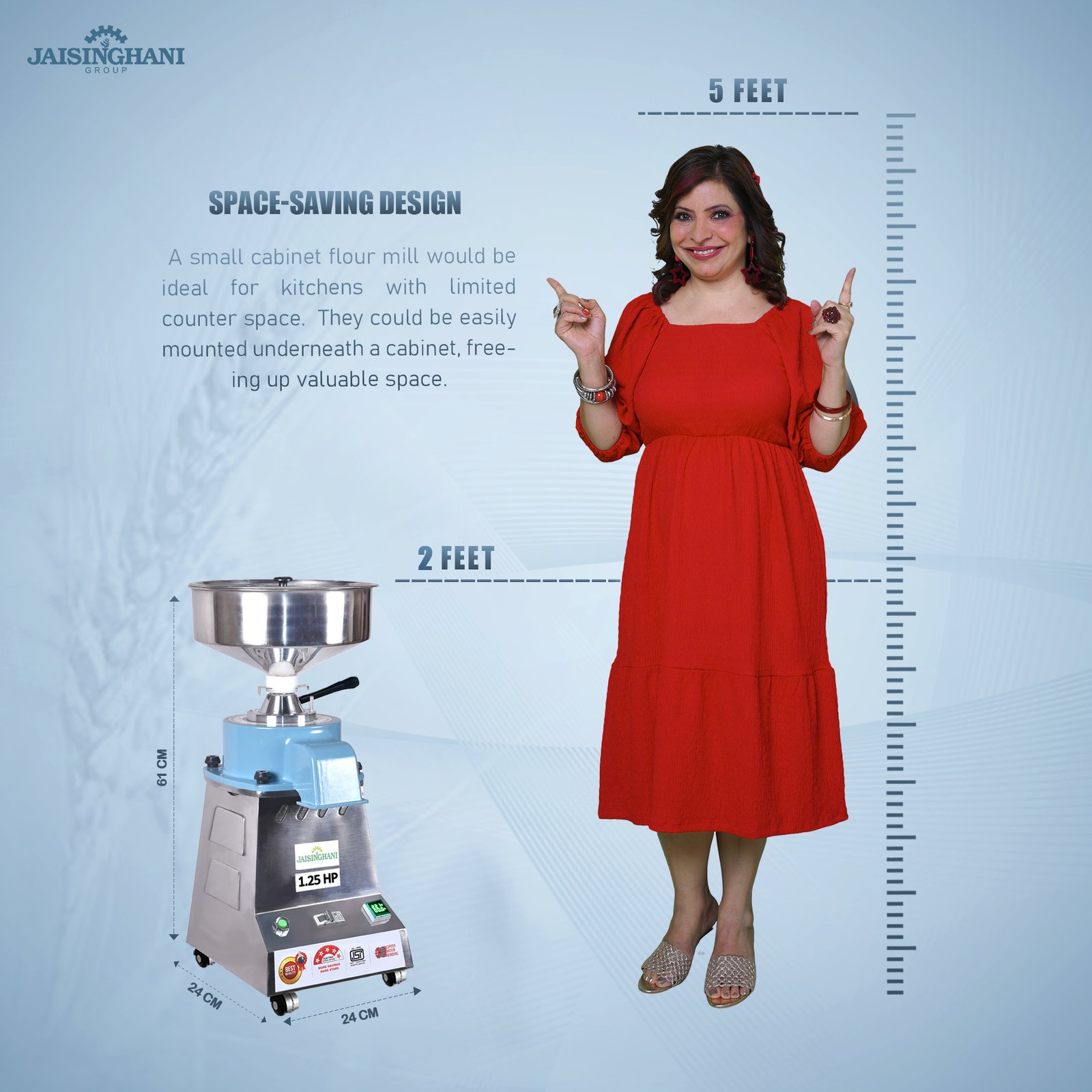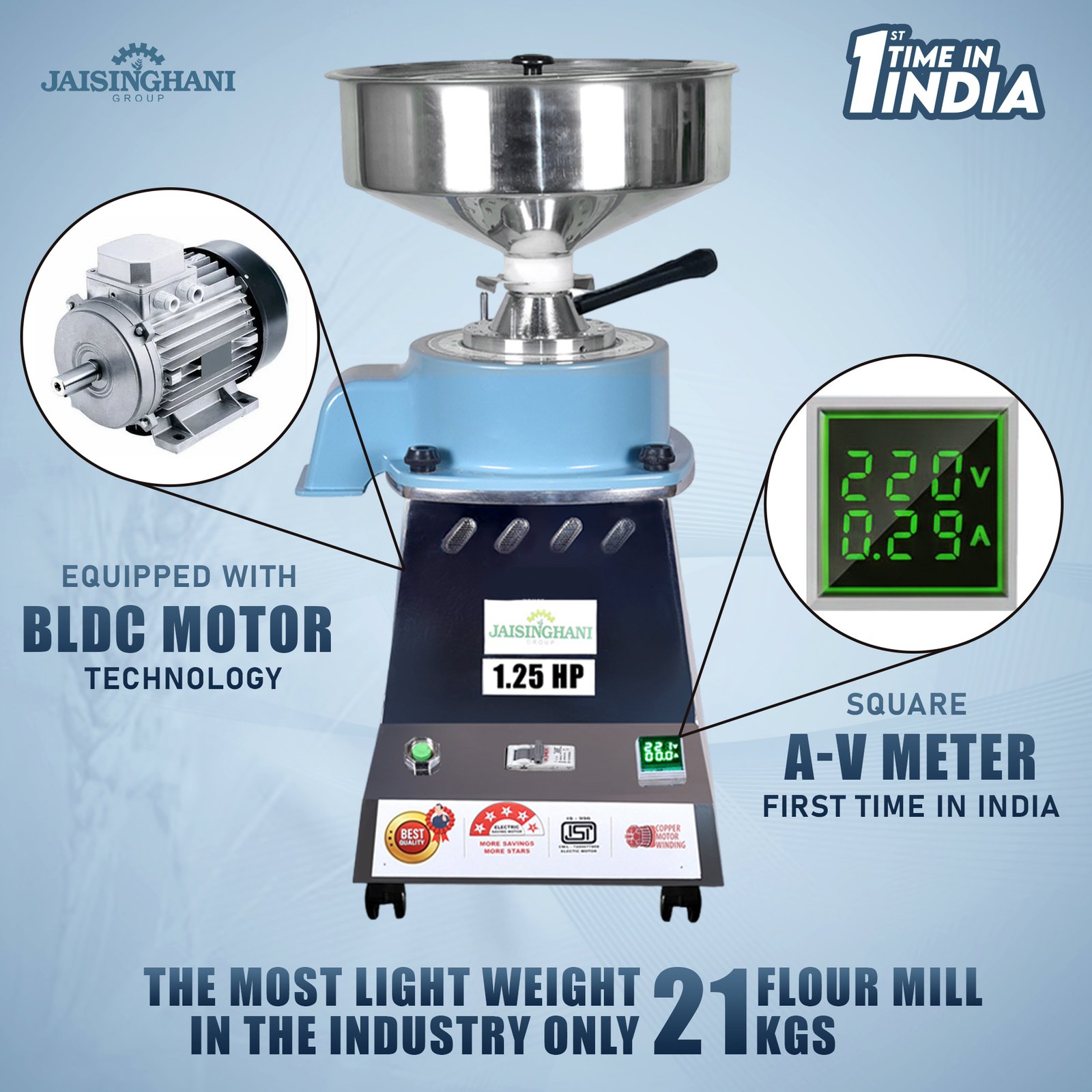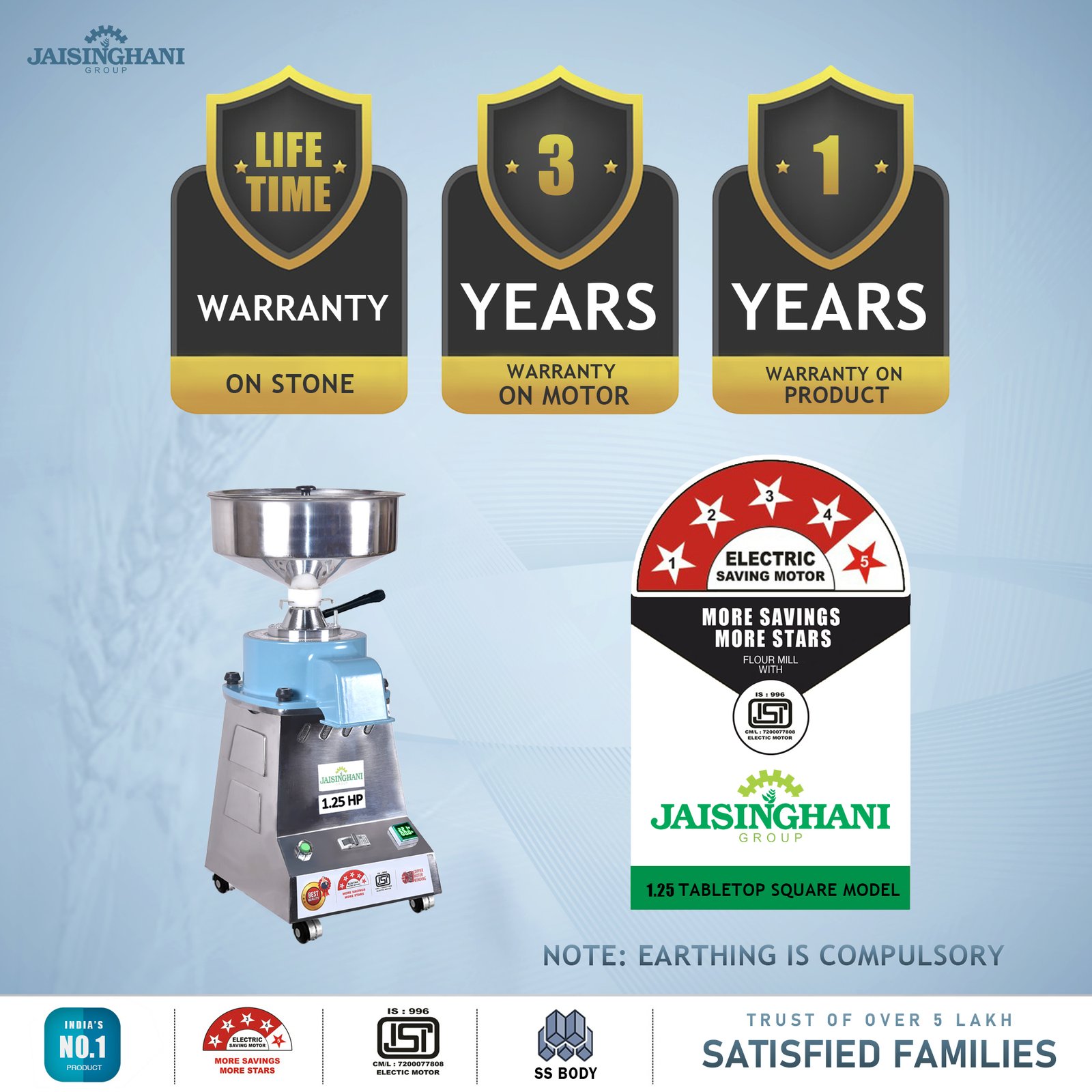 Jaisinghani Group 1.25 HP Stainless Steel Stone Atta Chakki | 6 - 8 Kg/Hour Grinding Capacity | Next-Gen Commercial Stone Flour Mill | Fresh Flour Atta Chakki Machine | Energy Saving