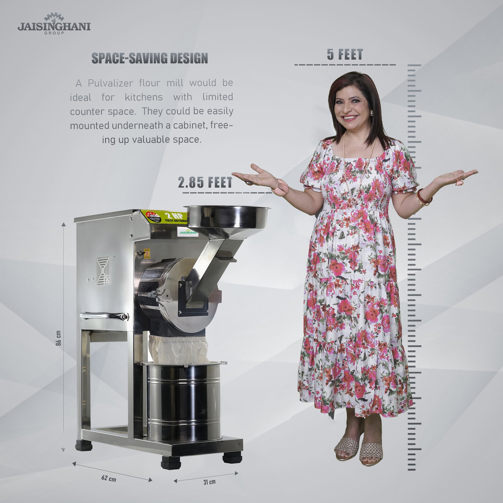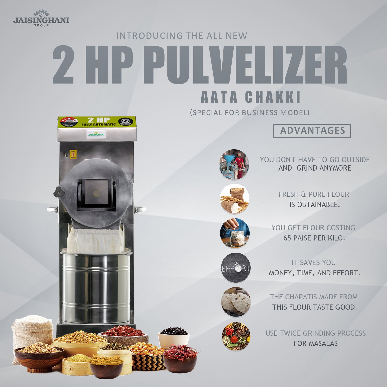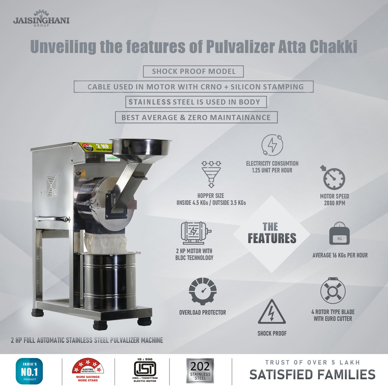 Jaisinghani Group 2 HP Full Automatic Stainless Steel Pulverizer Atta Chakki | 20 - 22 Kg/Hour Grinding Capacity | Next-Gen Commercial Pulverizer Flour Mill | Fresh Flour Atta Chakki Machine | Energy Saving