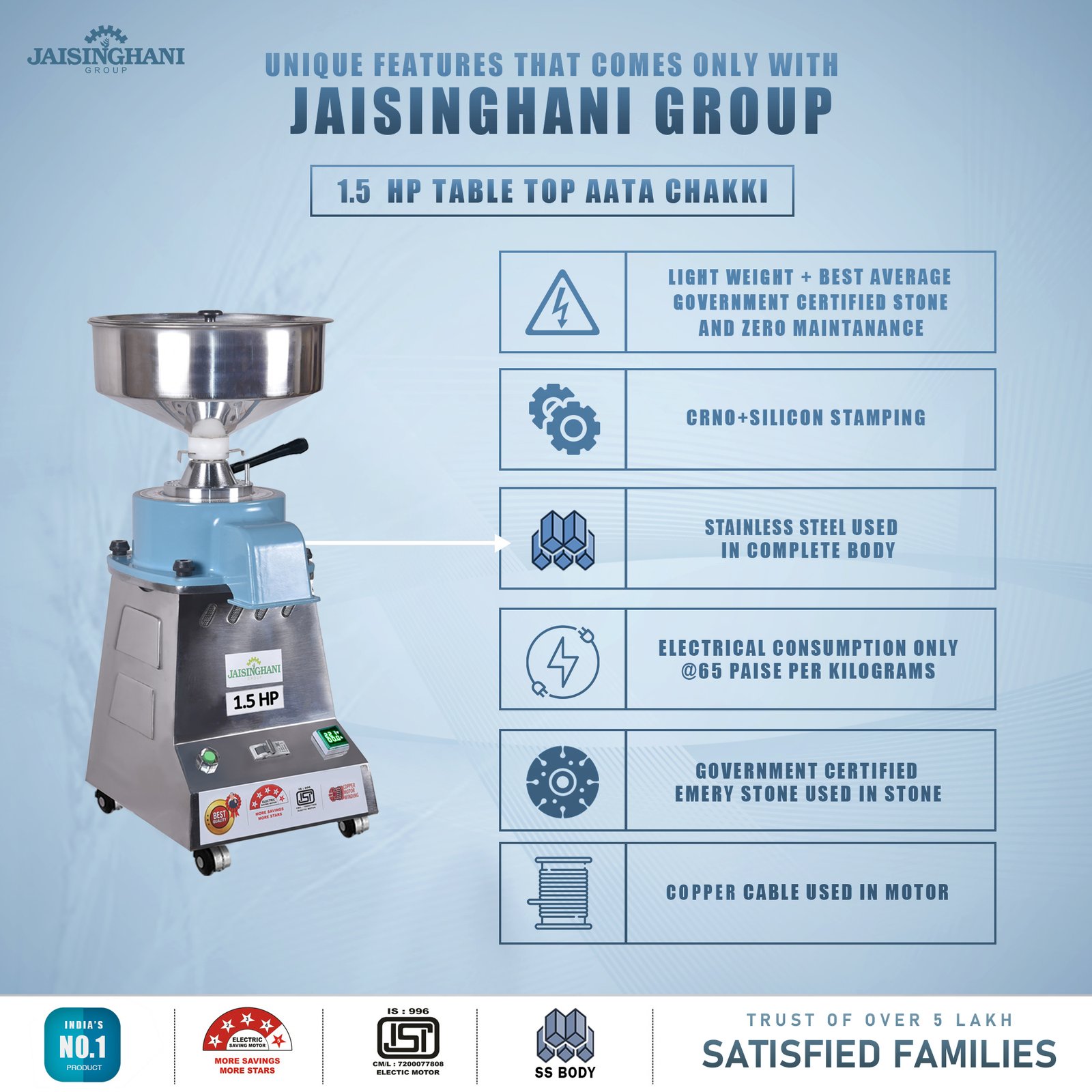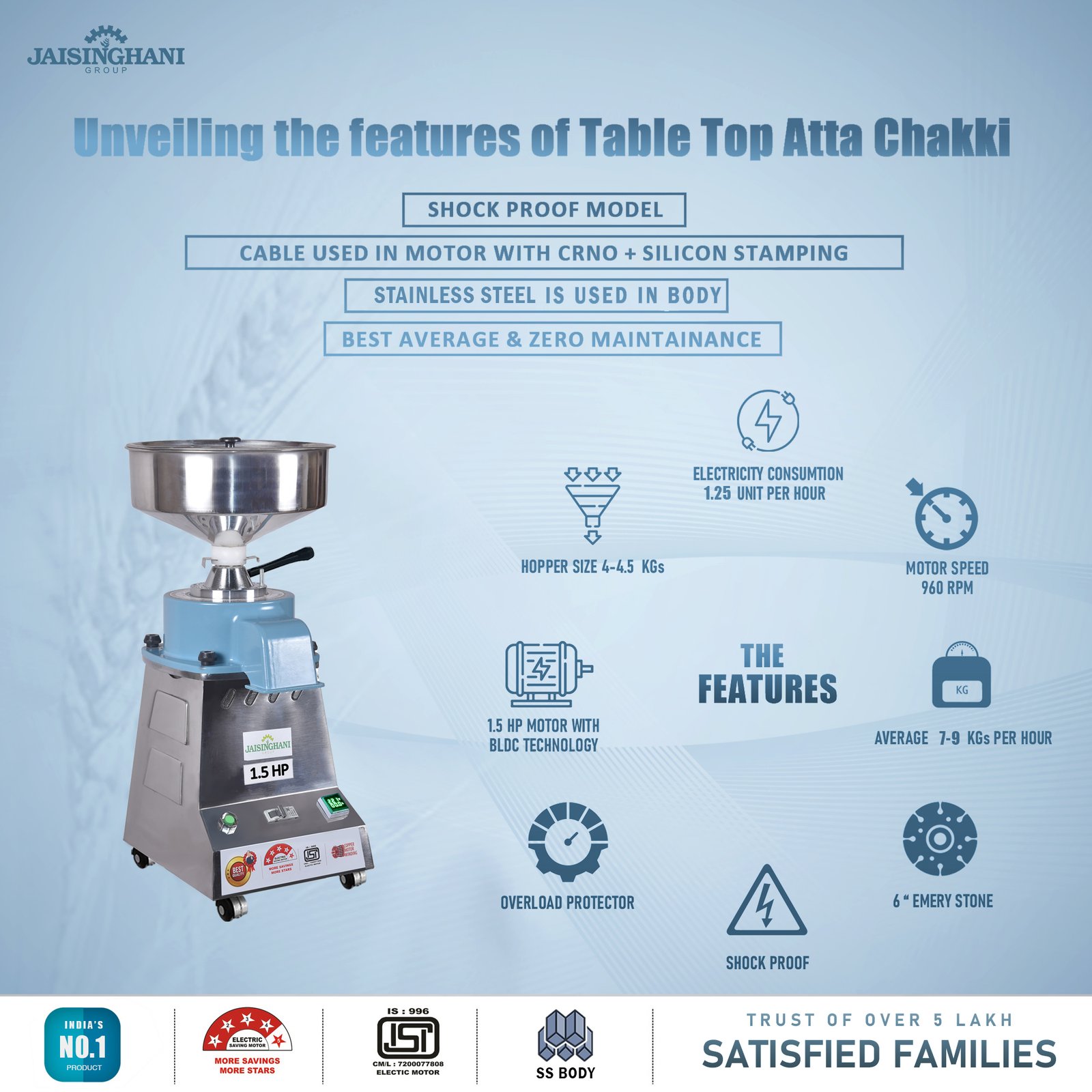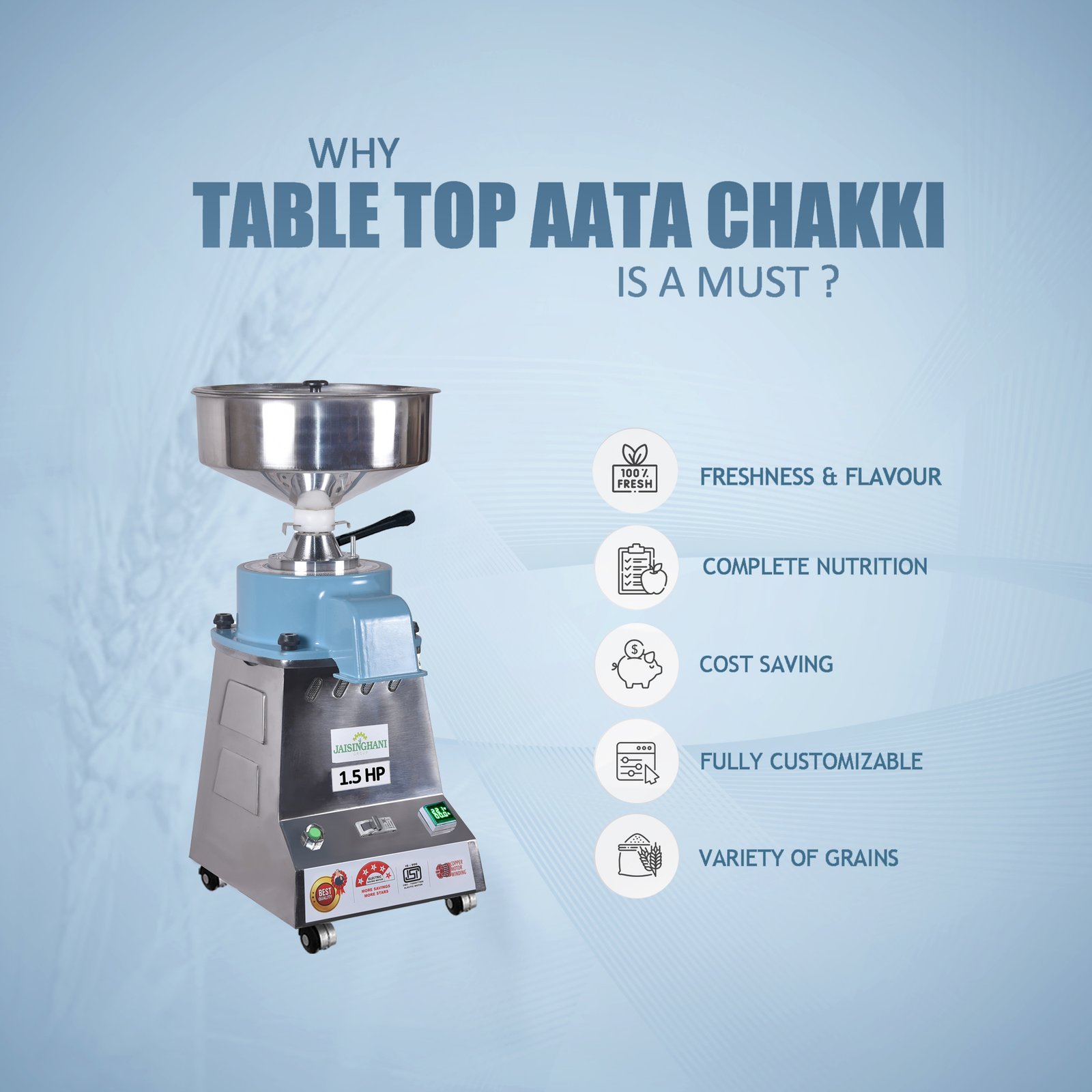 Jaisinghani Group 1.5 HP Stainless Steel Round TableTop Atta Chakki | 8 - 10 Kg/Hour Grinding Capacity | Next-Gen Domestic Stone Flour Mill | Fresh Flour Atta Chakki Machine | Energy Saving