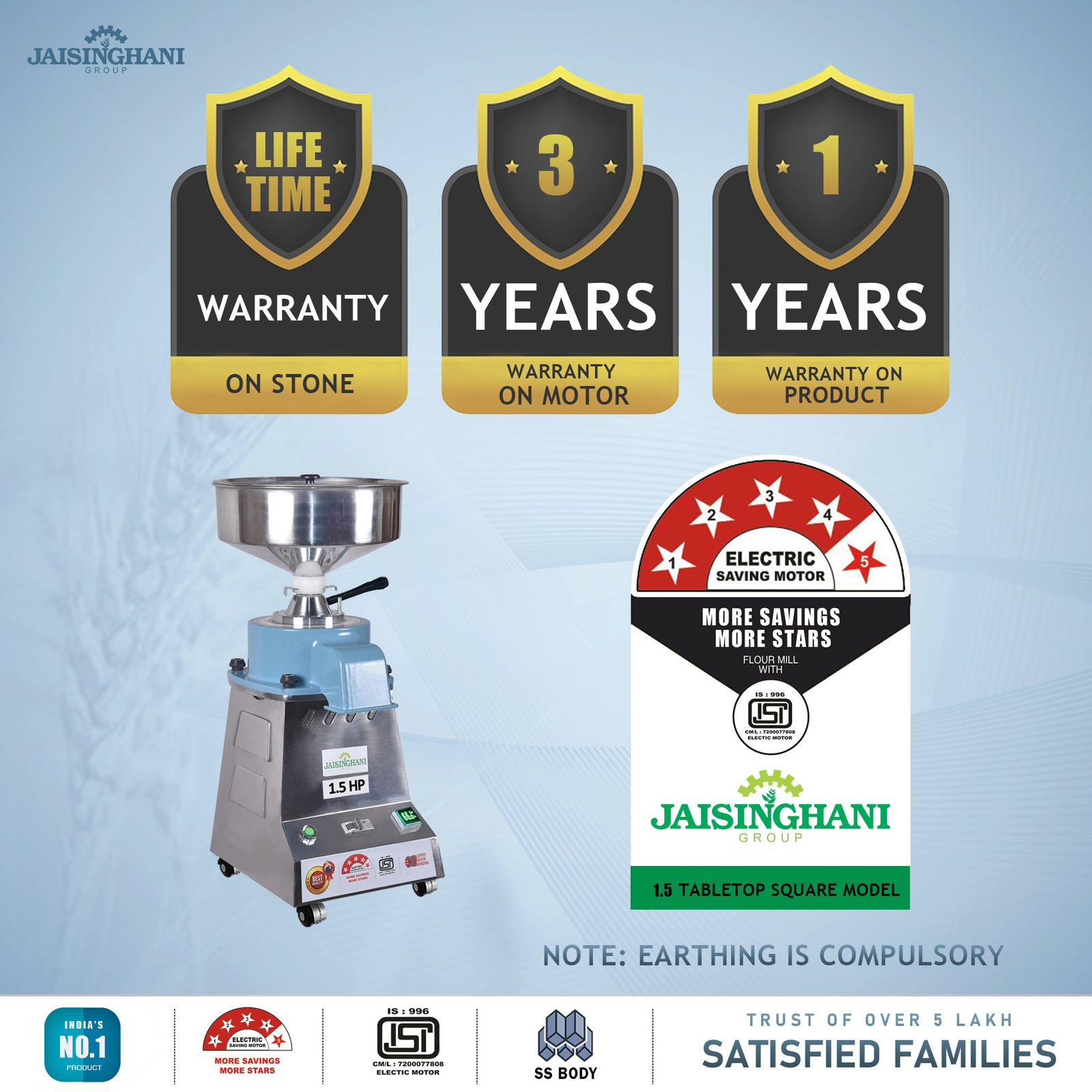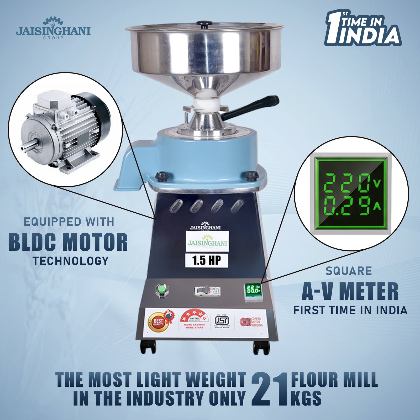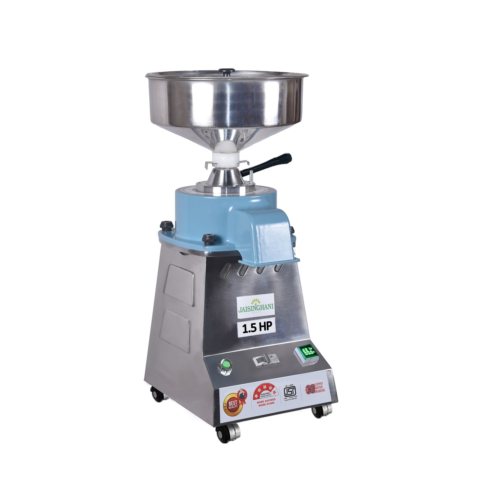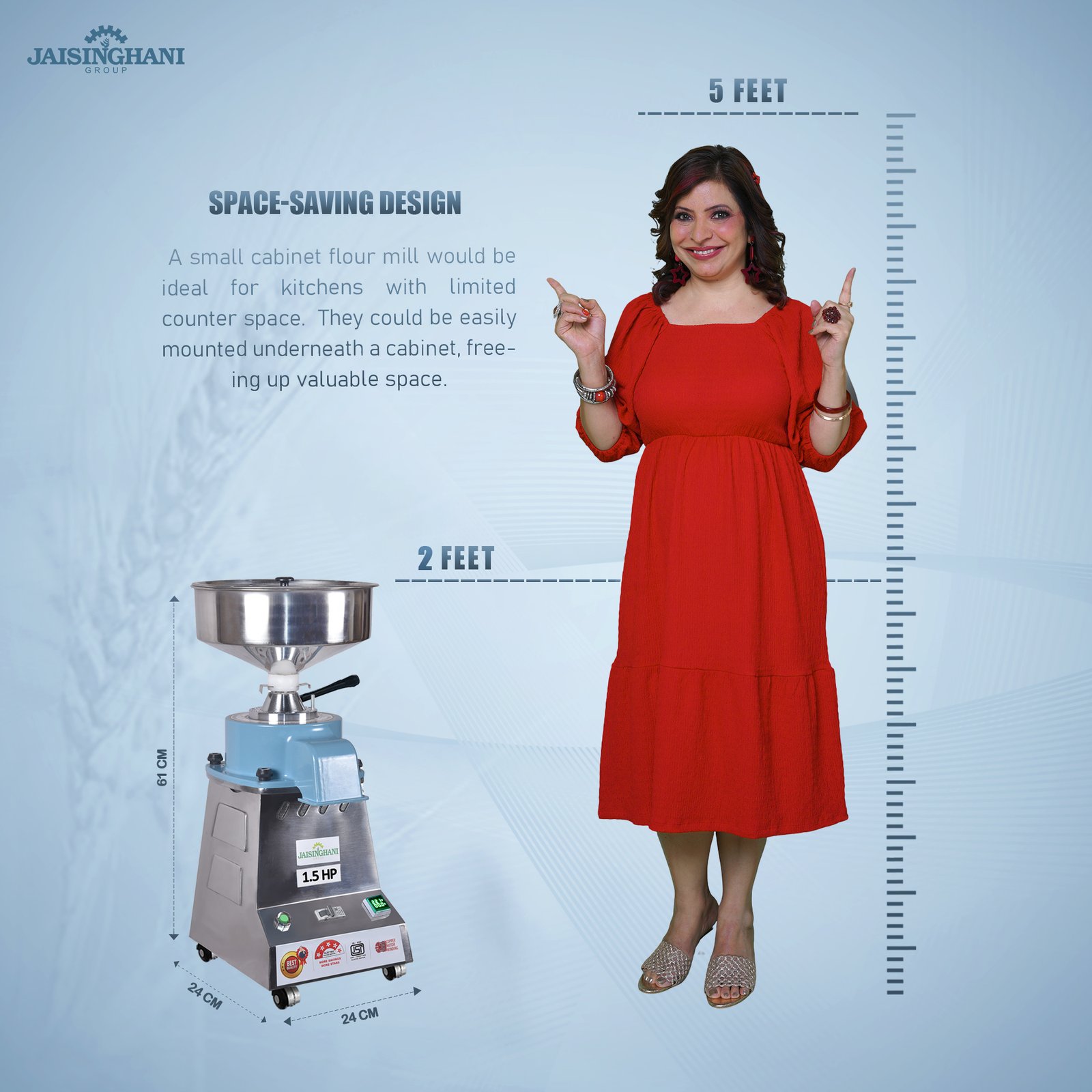 Jaisinghani Group 1.5 HP Stainless Steel Round TableTop Atta Chakki | 8 - 10 Kg/Hour Grinding Capacity | Next-Gen Domestic Stone Flour Mill | Fresh Flour Atta Chakki Machine | Energy Saving