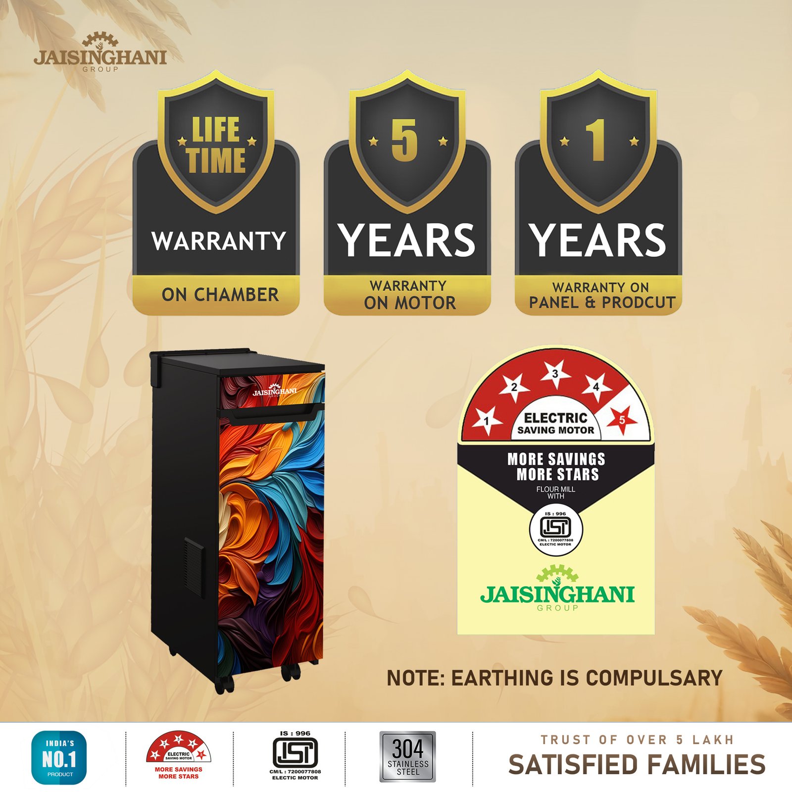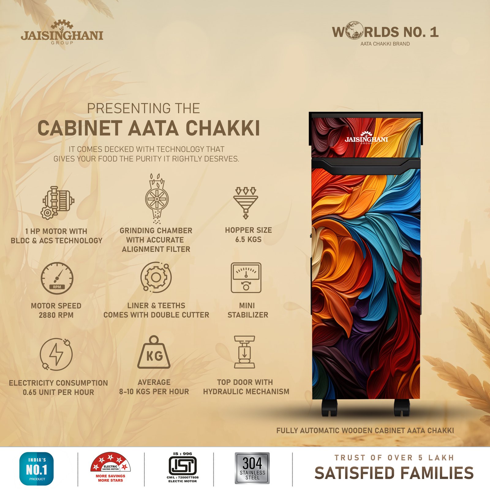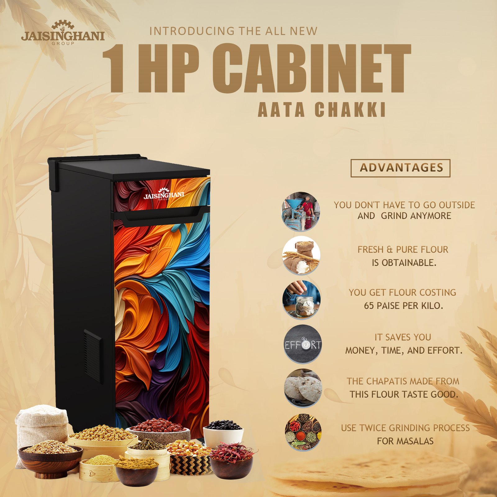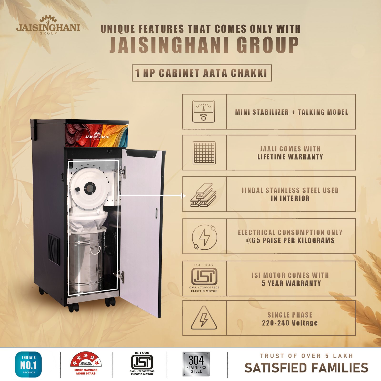 Jaisinghani Group 1HP Cabinet Atta Maker | High-Speed Domestic Flour Mill | 8–10 Kg/Hr Capacity | Energy Efficient 0.75 Unit/Hr | Ideal for Fresh Wheat & Rice Flour