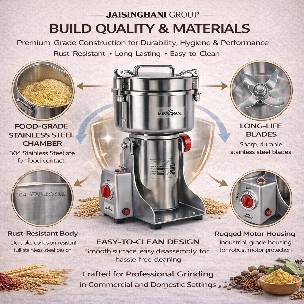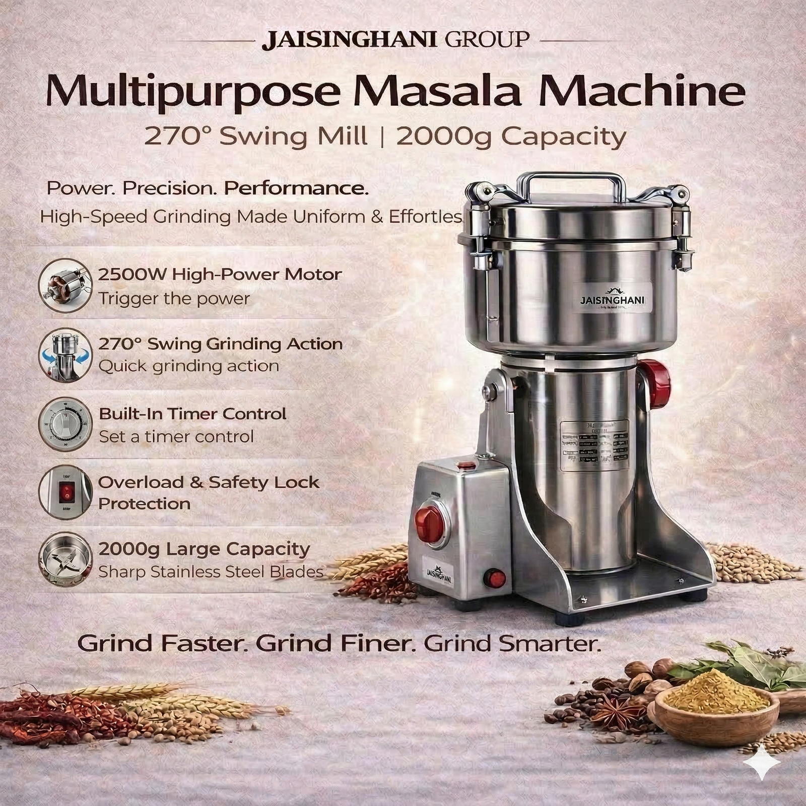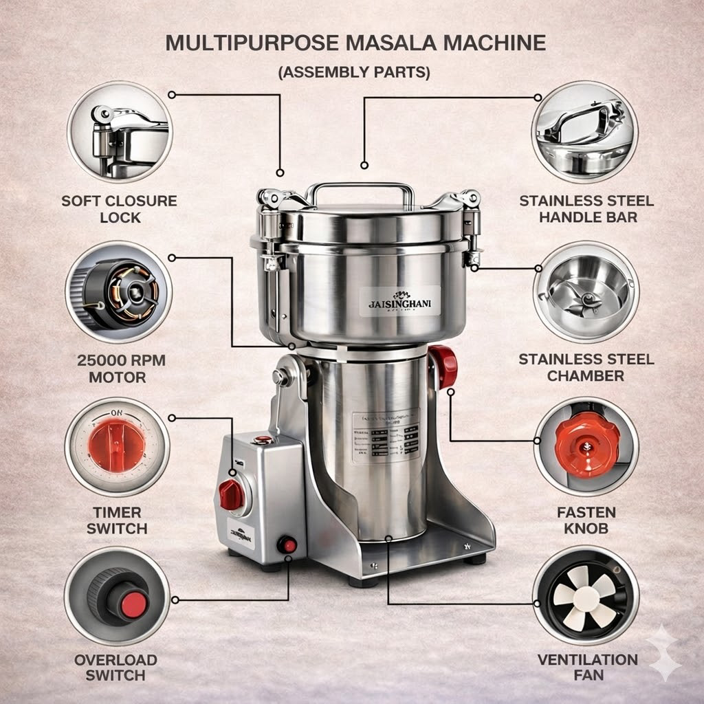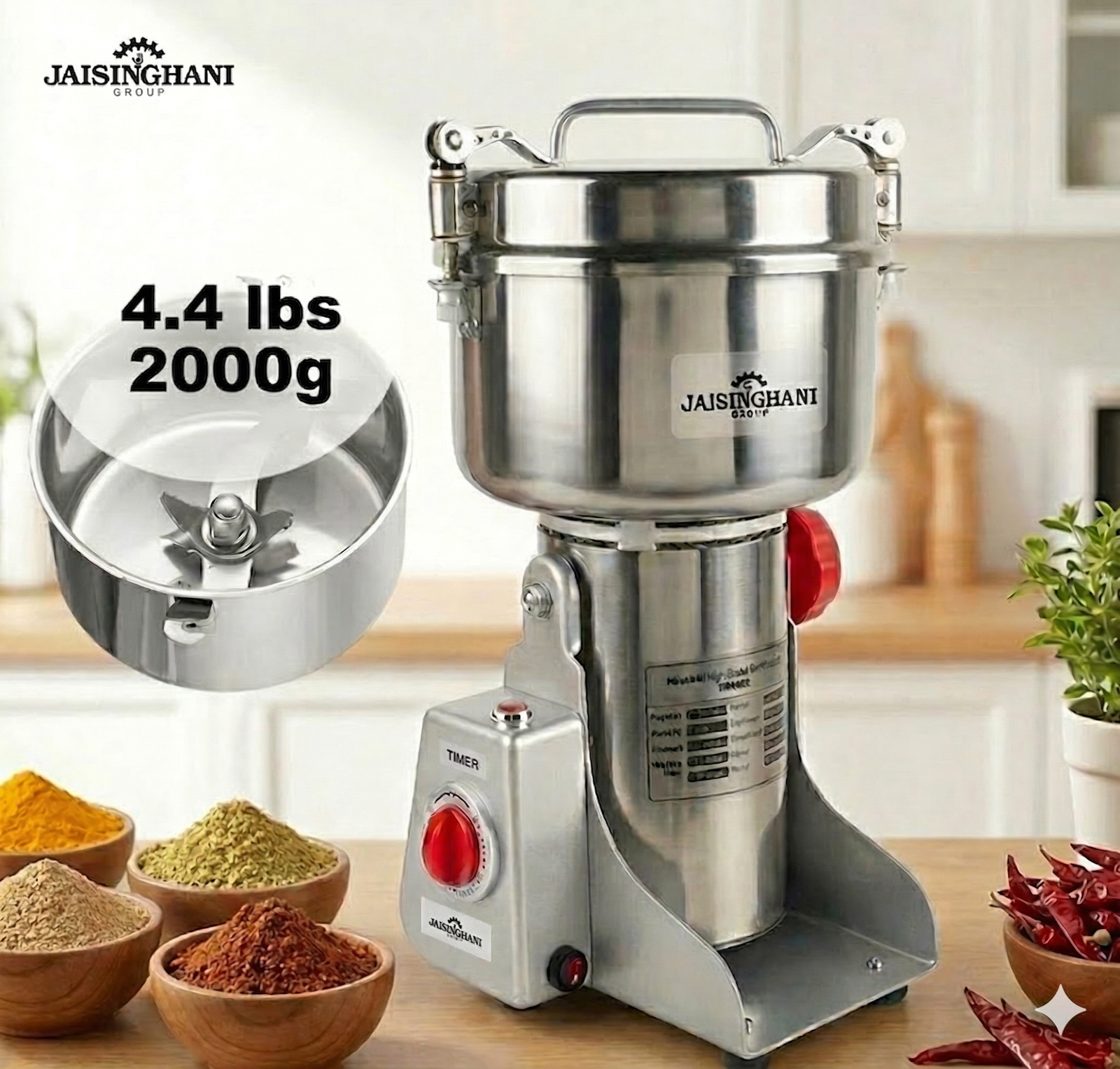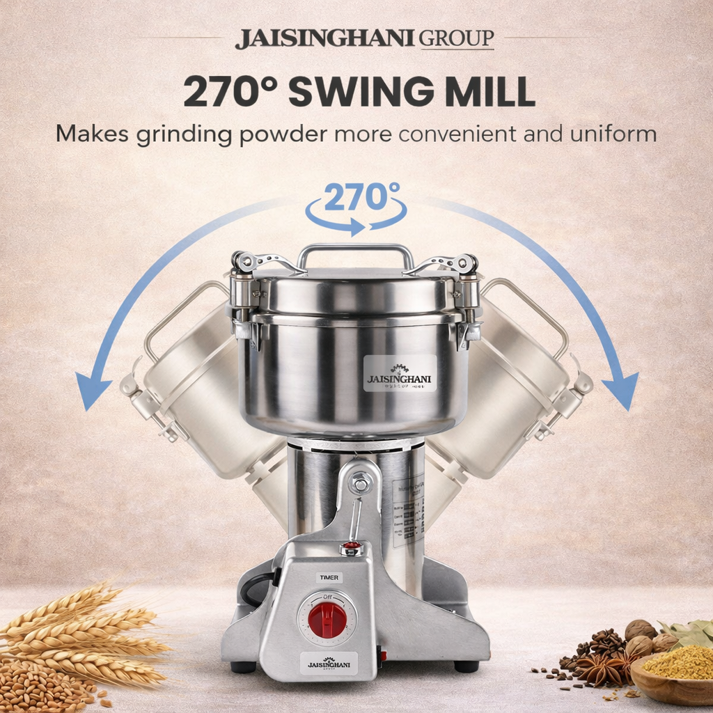 Jaisinghani Group 2500A | 2 KG Commercial Stainless Steel Spices DisIntegrater Machine | 2500g (5.5 lbs) Capacity | High-Speed Grinding | One-Touch Operation | Timer Control | Heavy-Duty Dry Masala & Grain Grinder | Overload Protection | Swing Lid Design