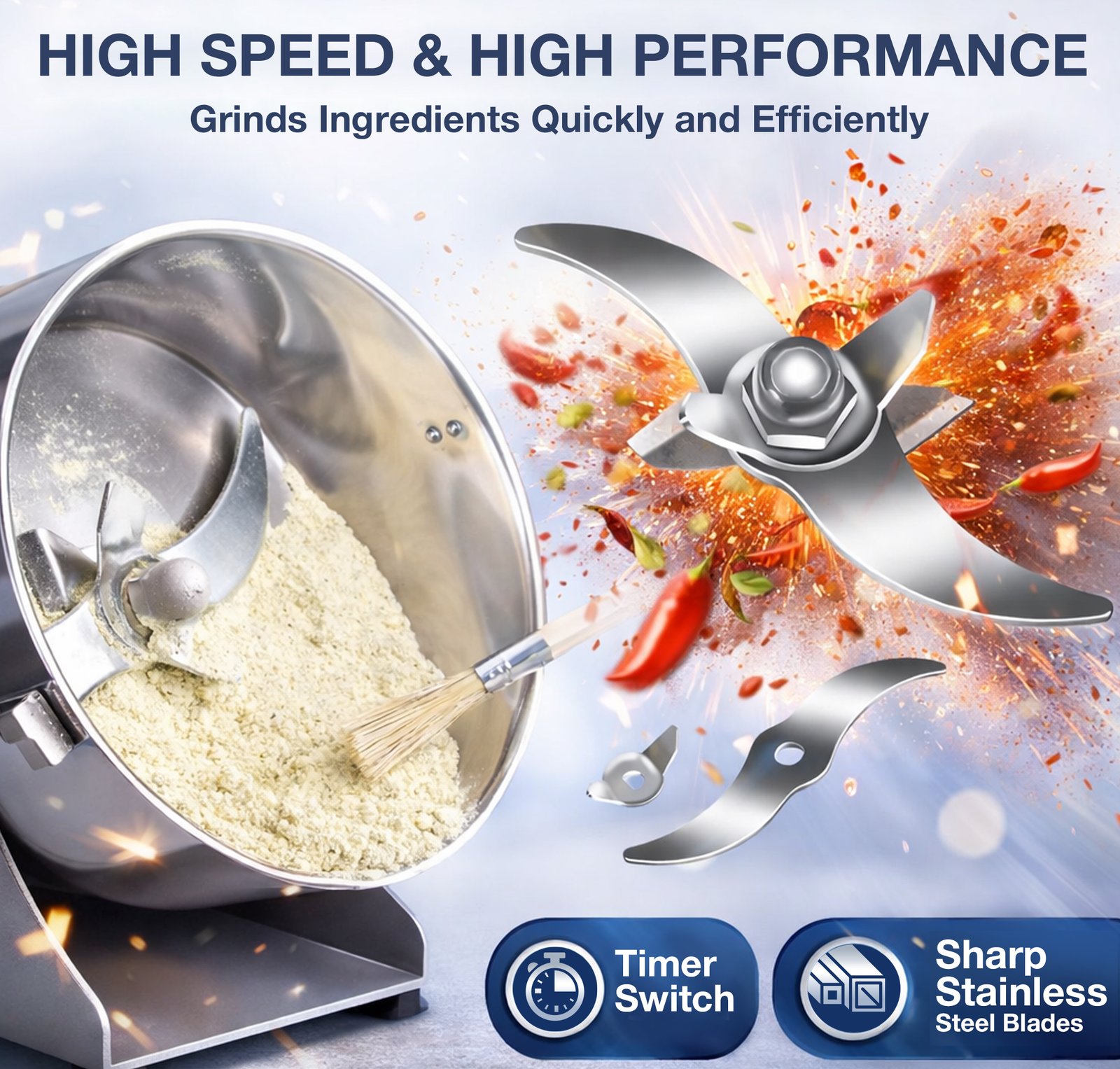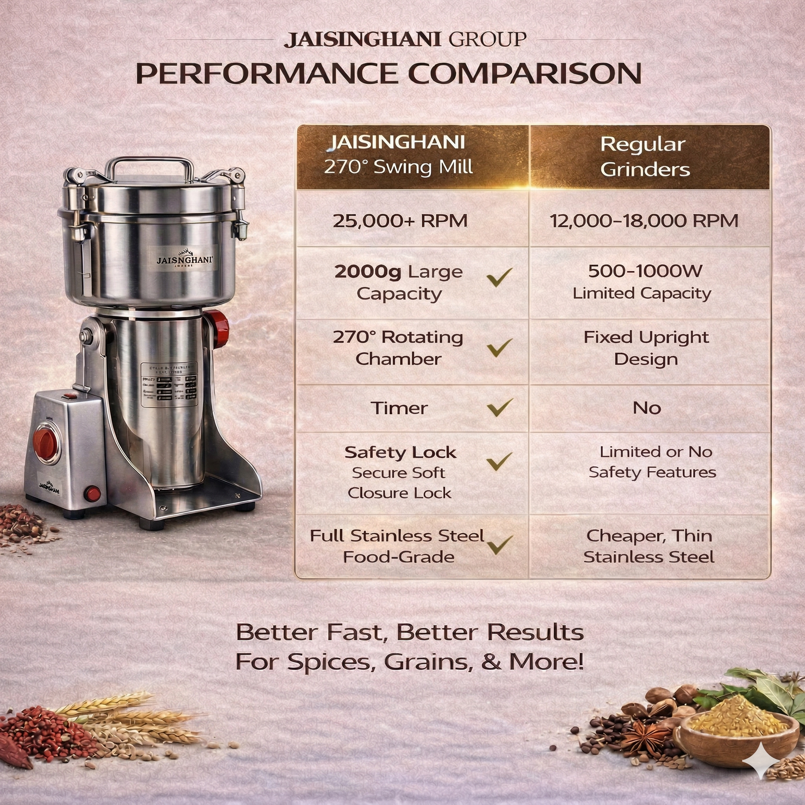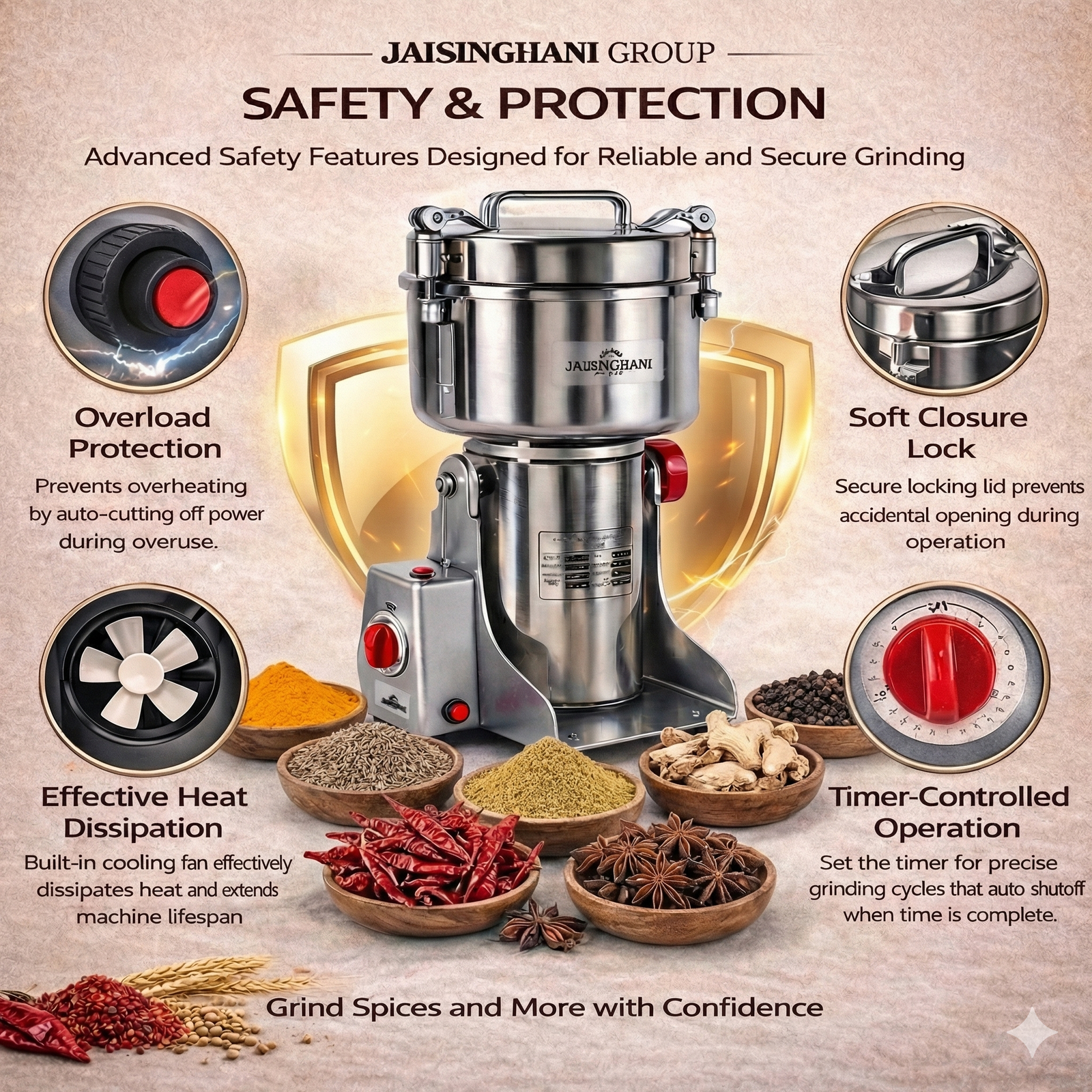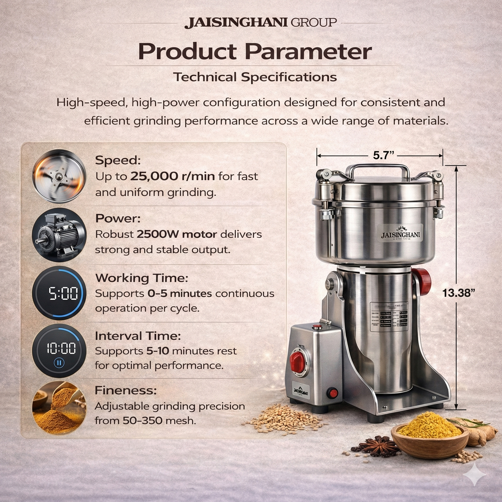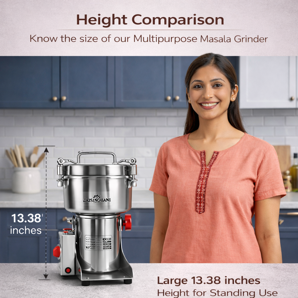 Jaisinghani Group 2500A | 2 KG Commercial Stainless Steel Spices DisIntegrater Machine | 2500g (5.5 lbs) Capacity | High-Speed Grinding | One-Touch Operation | Timer Control | Heavy-Duty Dry Masala & Grain Grinder | Overload Protection | Swing Lid Design